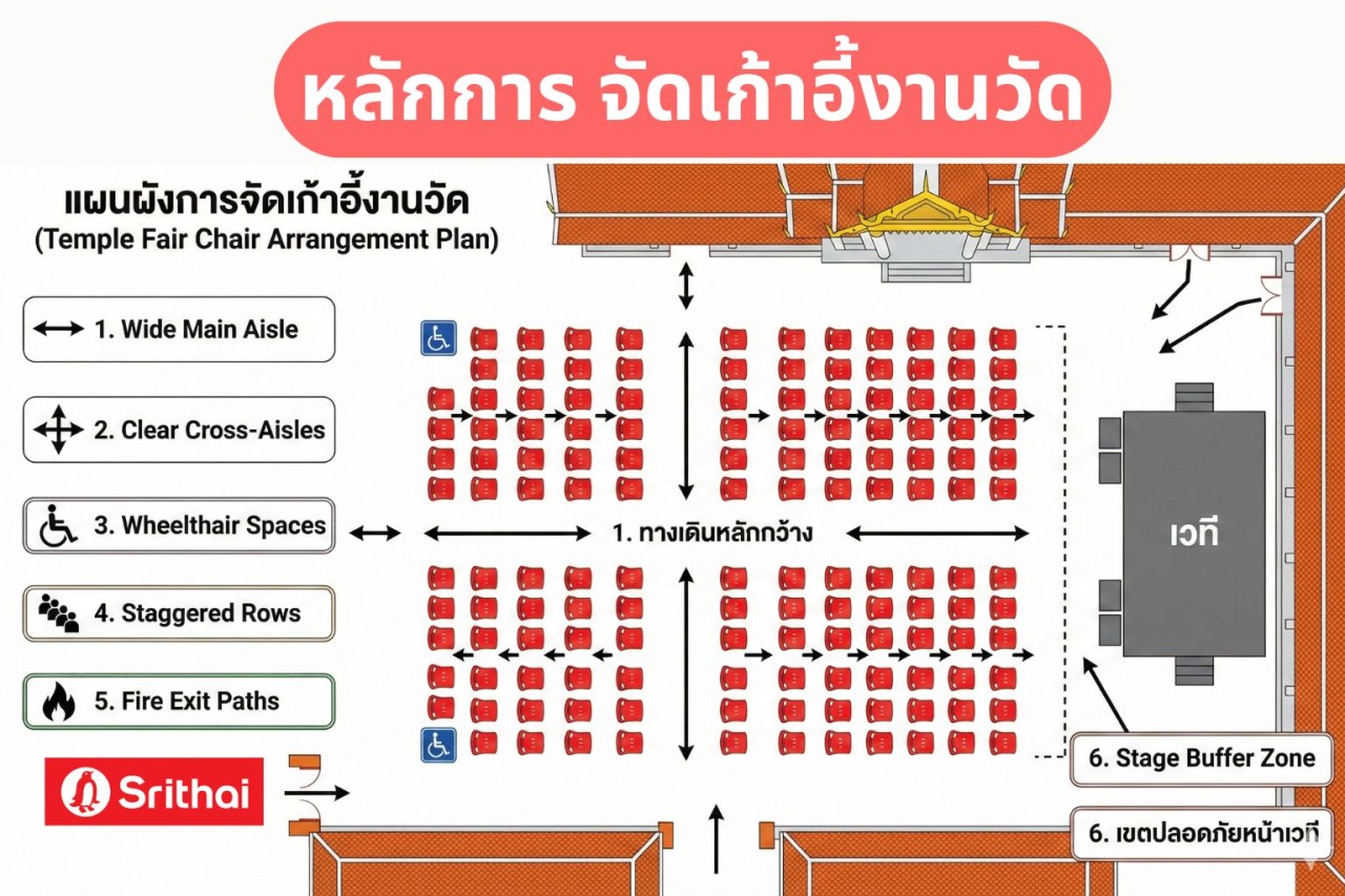 เวลาไปงานวัดทีหนึ่ง คนส่วนใหญ่จะโฟกัสที่เวที แสงสี เสียง ร้านค้า ของกิน หรือกิจกรรมต่าง ๆ แต่มีอีกอย่างหนึ่งที่สำคัญมากและมักถูกมองข้าม คือ “เก้าอี้งานวัด” ที่วางเรียงกันเต็มลานวัดนั่นเอง ถ้าจัดดี งานก็ดูเป็นระเบียบ นั่งสบาย เดินสะดวก อพยพง่ายเวลาเกิดเหตุฉุกเฉิน แต่ถ้าจัดพลาด เก้าอี้ตัวเล็ก ๆ พวกนี้แหละ ที่อาจกลายเป็นชนวนให้เกิดความวุ่นวาย หรืออันตรายได้