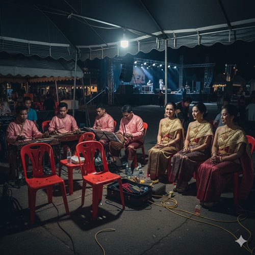 นอกจากผู้ชมแล้ว นักดนตรีประจำงาน — ไม่ว่าจะเป็นวงดนตรีพื้นบ้านหรือวงลูกทุ่งจากโรงเรียน — ต่างก็ใช้เก้าอี้พลาสติกเหล่านี้เป็นที่นั่งประจำเวทีด้วย เพราะเคลื่อนย้ายสะดวก แข็งแรง และรองรับการใช้งานต่อเนื่องได้ตลอดทั้งคืน