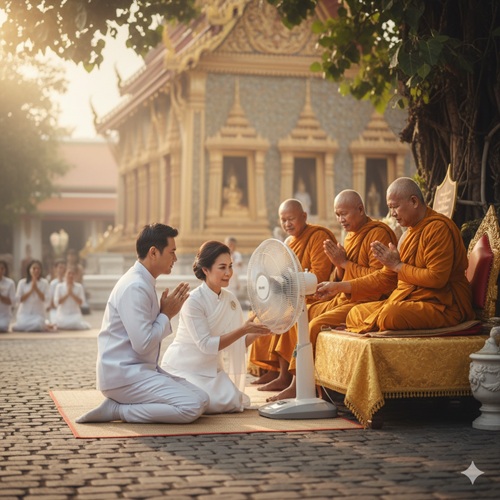 ในบ้านเราอากาศร้อนเป็นเรื่องปกติ พัดลมเลยเป็นของที่วัดแทบทุกแห่งต้องใช้ ตามความเชื่อ การถวายพัดลมจะผูกกับอานิสงส์ด้านความสะดวกสบาย ความร่มเย็น เป็นสุข ได้อยู่ในที่ไม่ร้อนรุ่ม ถูกเผาด้วยปัญหาและความกดดันน้อยลง อีกมุมที่หลายคนพูดถึงคือเรื่อง “ชื่อเสียง” เพราะพัดลมช่วยระบายอากาศ ทำให้บรรยากาศโปร่งโล่ง สบาย คนที่เกี่ยวข้องก็อยากมาร่วมงาน งานไหนจัดดี คนไปแล้วรู้สึกสบาย เขาก็มักพูดถึงในทางที่ดี อานิสงส์เลยมักเชื่อมกับชื่อเสียงที่มาพร้อมความสบายใจของคนรอบตัว