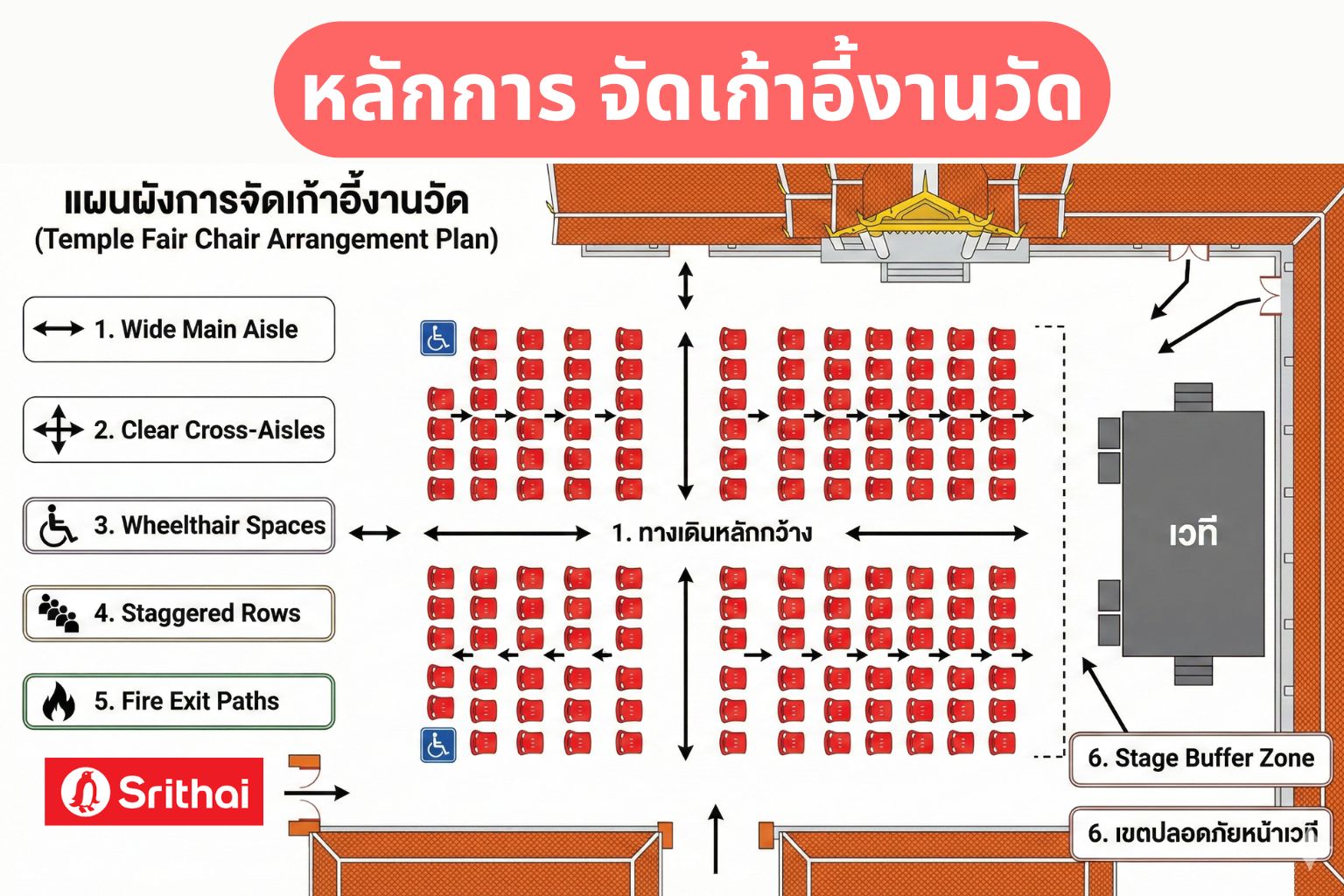 แค่เริ่มจากการวางผังให้ชัด แยกโซนตามกิจกรรม เว้นทางเดินตามมาตรฐาน เผื่อที่นั่งให้ผู้ใช้รถเข็นและผู้สูงอายุ เคารพพื้นที่ศาสนา และมีทีมคอยดูแลไม่ให้เก้าอี้ยึดทางเดิน งานวัดที่เคยวุ่นวายก็จะเป็นระเบียบมากขึ้น เดินง่าย นั่งสบาย และถ้ามีเหตุฉุกเฉินจริง ๆ ทุกคนก็ยังมีโอกาสอพยพออกจากพื้นที่ได้อย่างปลอดภัย