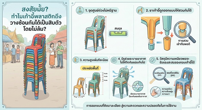 ถ้าจะอธิบายแบบง่ายที่สุด เหตุผลที่เก้าอี้พลาสติกวางซ้อนกันได้เยอะโดยไม่ล้ม มีอยู่ 5 แกนหลัก คือ “จุดศูนย์ถ่วงไม่หนีฐาน”, “ขาเก้าอี้ถูกออกแบบให้สวมกันได้”, “ความสูงเพิ่มทีละน้อย”, “มีรูช่วยระบายอากาศไม่ให้ติดกันแน่นเกินไป” และ “วัสดุมีความเหนียวพอจะรับแรงสะสมของกองเก้าอี้ได้” เมื่อทั้ง 5 เรื่องนี้ทำงานพร้อมกัน เราจึงได้เก้าอี้ที่ทั้งวางซ้อนง่าย ยกเก็บสะดวก และปลอดภัยต่อการใช้งานในชีวิตประจำวัน