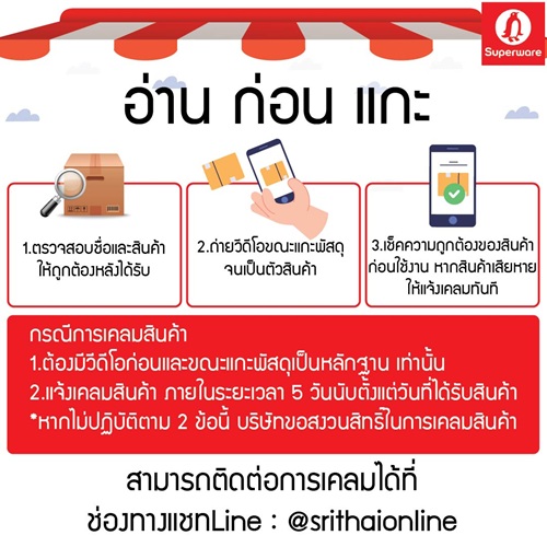 อ่านก่อนแกะสินค้า 1) ตรวจสอบชื่อ-รุ่นสินค้าให้ถูกต้องหลังได้รับพัสดุ 2) ถ่ายวิดีโอระหว่างแกะพัสดุจนเห็นตัวสินค้าอย่างชัดเจน เพื่อใช้เป็นหลักฐาน 3) ตรวจความถูกต้องก่อนใช้งาน หากพบชำรุด/สินค้าไม่ครบ โปรดแจ้งเคลมทันที